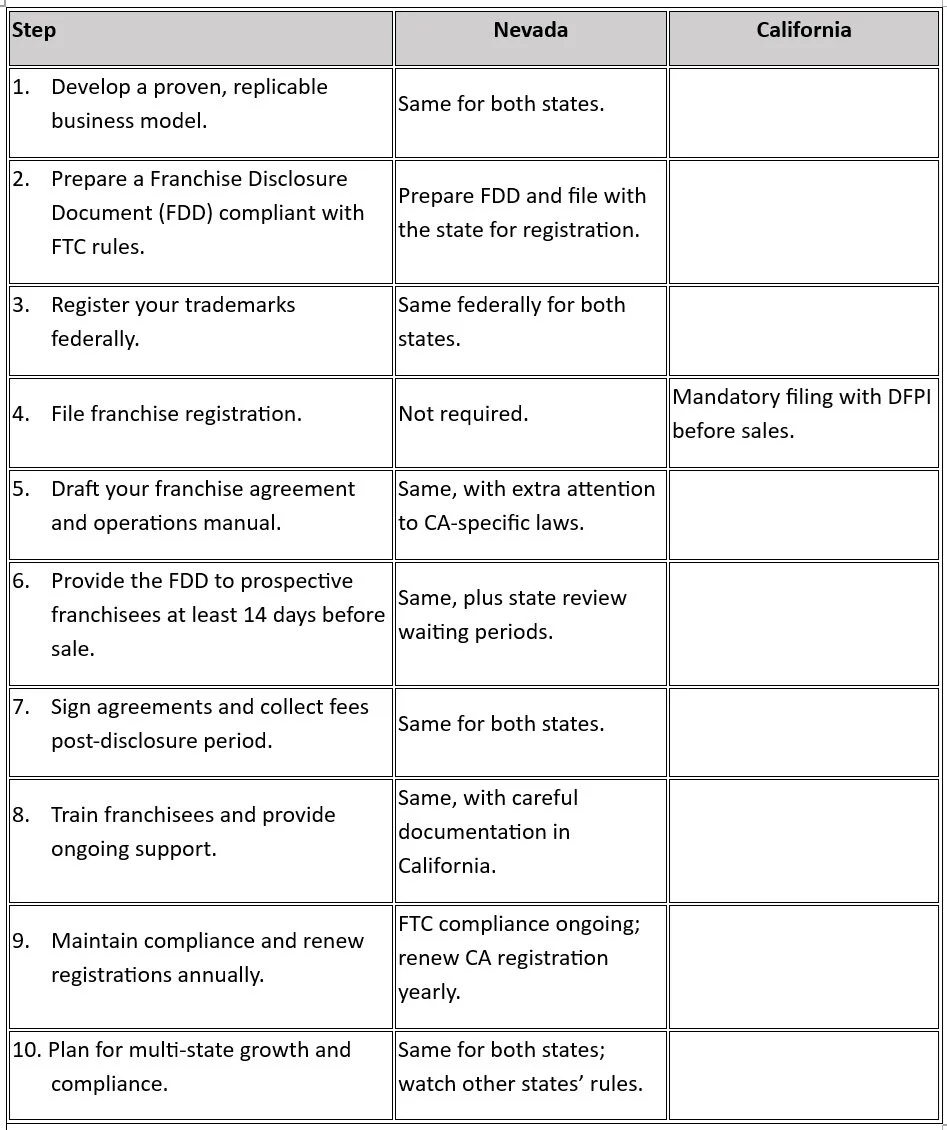 The Federal Trade Commission (FTC) Franchise Rule applies nationwide, requiring you to prepare a detailed Franchise Disclosure Document (FDD) that you must provide to prospective franchisees well before any sale. California goes further by imposing state registration requirements and additional protections for franchisees. Nevada’s laws are more business-friendly but still require strict federal compliance.